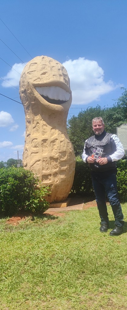 After a couple of hours, it started warming up, and I enjoyed a backroad ride to Plains, Georgia. The hometown of Jimmy Carter also has a challenge stop – the “Smiling Peanut.”