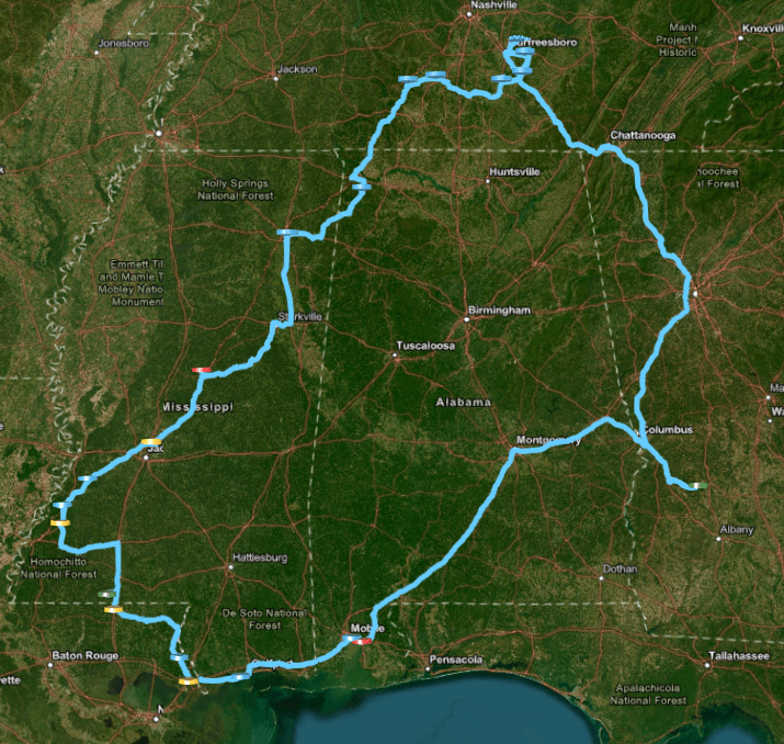 We started in sunshine, but dark clouds formed behind us, and the tailwind pushed them with us into Tennessee. Severe storms were forecasted for the evening, so we decided to head east, away from the Trace and towards home. Just in time! We dodged the storms for now, hoping they’d pass through Kentucky the next day so we wouldn’t have to deal with them in a couple of days when heading north.