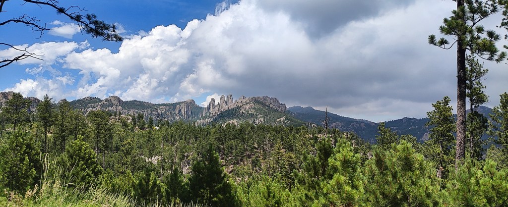 Approaching Custer State Park, we encountered heavy traffic (hence, “Cluster State Park”), with cars and buses inching along Needles Highway. Although it slowed our pace, we made the most of the situation by stopping at overlooks, swapping stories, and laughing about the crowded tunnels seemingly posing a challenge to smallest cars.