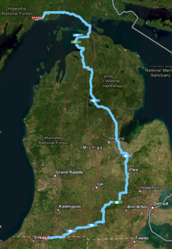 Michigan’s upper reaches twist me this way and that, and after a pit stop for donut holes and truly life-affirming coffee, I make the call to skip Lake Huron’s shore. It’s a hard slap south to Detroit instead, hoping to dodge storms brewing in northern Indiana. Coffee makes all decisions easier.